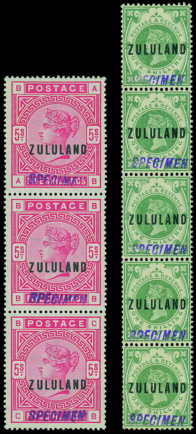 ½d. and 2d. to 1/- in horizontal or vertical strips of five, and 5/- vertical strip of three, all handstamped "specimen" (NA1) in violet, fresh unmounted mint; a couple with small faults though generally fine and a rare group. Brandon Certificate (1980) for the 5/- strip. Cat. £1,950+. Photo