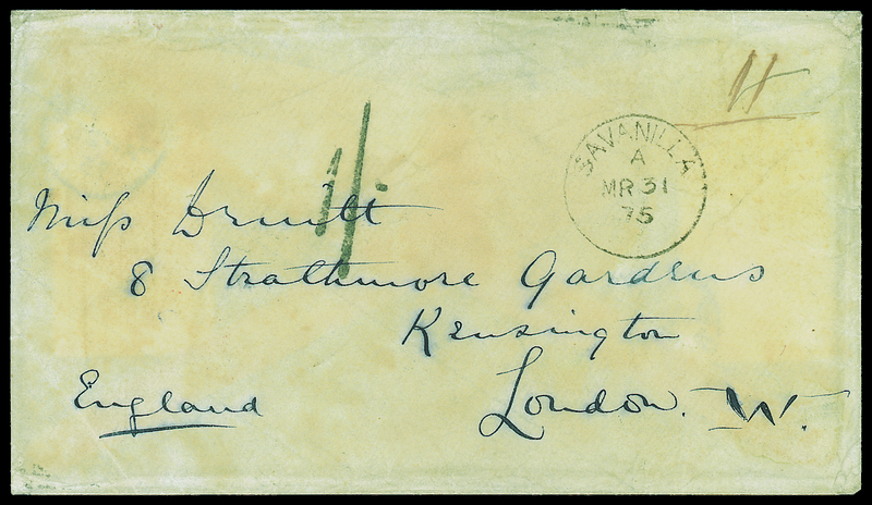 1875 (31 March) envelope to London with British Post Offices "savanilla" c.d.s. and handstruck "1/-", arrival datestamps on reverse; stained. Photo