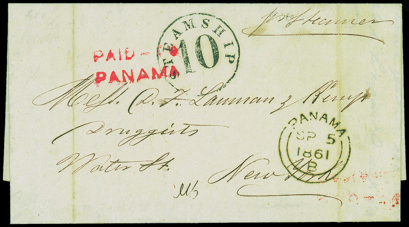 1861 (28 Aug.) Lanman and Kemp entire letter to New York with double ring British Post Office Guayaquil datestamp on reverse, on front fine red "paid - to/panama" double ring Panama d.s. (5.9) and "steamship/10"; filing fold, fine. Photo