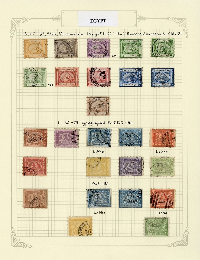 1866-1957 used collection, including 1866 set to 5p. with a couple of additional values, 1866-71 set, 1872-75 and 1874-75 selections to 5pi., and largely complete thereafter (no Port Fouad 50p. or miniature sheets) with 1929 Birthday so called brown centres, miniature sheets, Officials and Postage Dues, and Gaza Egyptian Occupation; generally good to fine