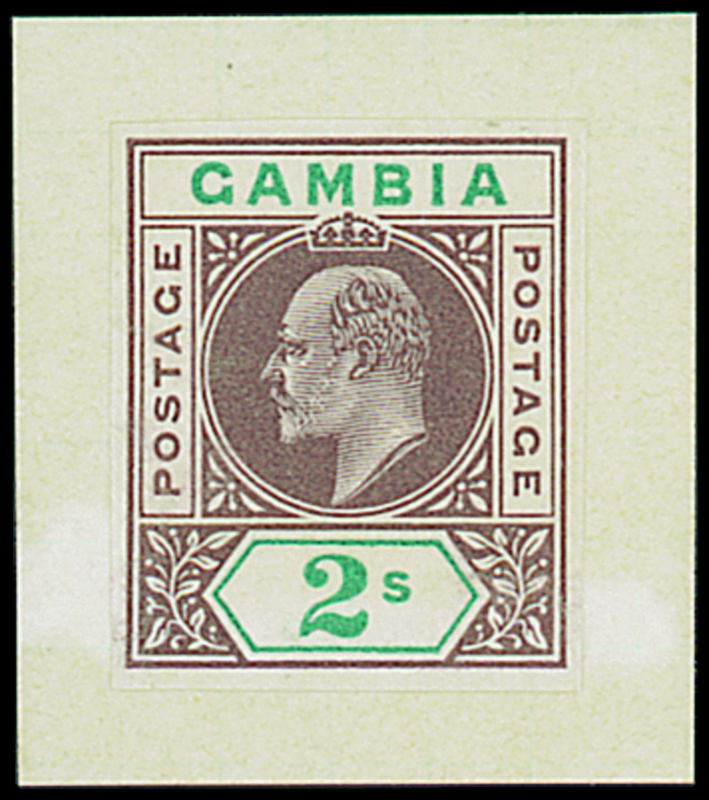 2/- in brown-purple and blue-green, partially affixed to small piece; fine. Photo