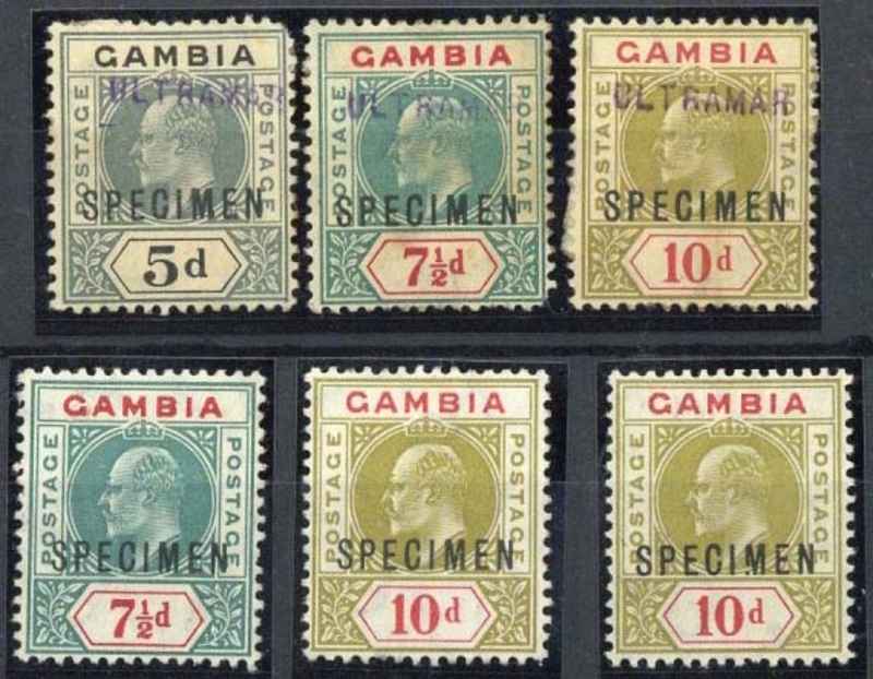 7½d. and 10d. each with dented frame and overprinted "specimen", no gum, 10d. overprinted "specimen" with broken "m", mint; also 5d., 7½d. and 10d. overprinted "specimen" and each handstamped "ultramar", without gum and with some faults. A scarce and unusual group of the new values