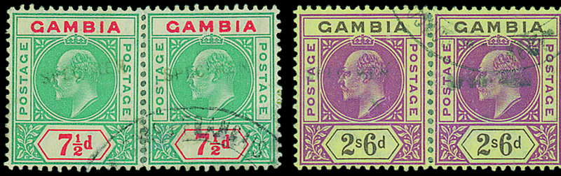 7½d. horizontal pair, 10d. vertical pair, 1/6d., 2/6d. horizontal pair and 3/-, each handstamped "specimen" (12x1½mm.) and with identifiable part strikes of the "colonie du gabon et du congo francais/direction de l'interieur/1er/bureau" double-ring Receiving Authority handstamp, all without gum and the pairs rejoined; odd imperfections though a remarkable group from the Gabon U.P.U. archive which was dispersed in c. 1975, and of which only a handful of each exist. Photo