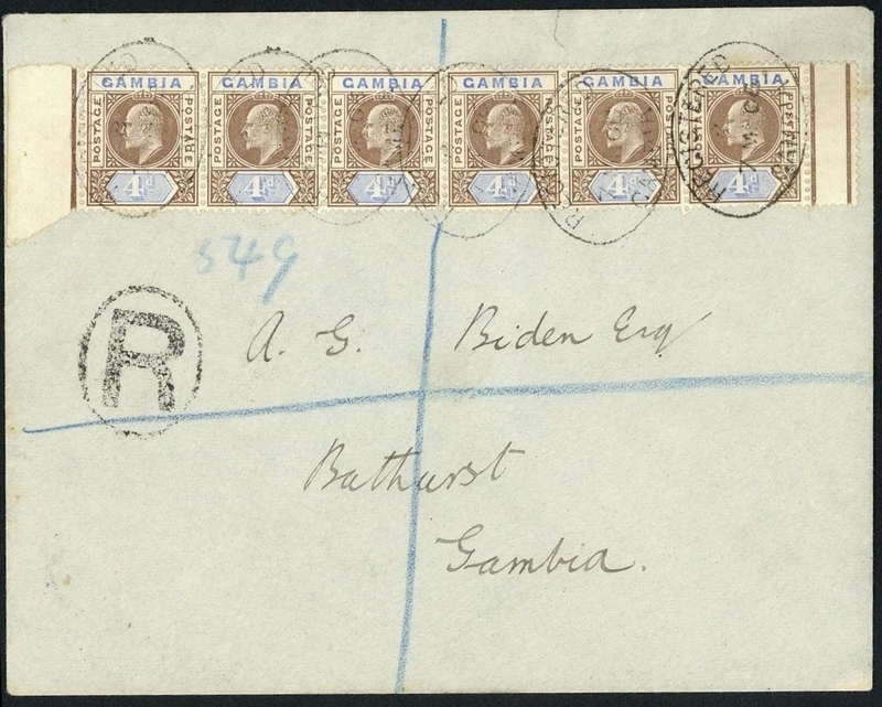 1906 (6 Mar.) envelope registered locally, bearing 4d. brown and ultramarine 4d. brown and ultramarine strip of six with margins at both sides, neatly cancelled by oval registered datestamps with oval-framed "r" below; clean and attractive