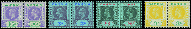 ½d. to 3/- in horizontal pairs, one in each showing variety split "a", fresh and fine mint. A very rare set. S.G. 86c, 87c, 88a, 89a, 90b, 91d, 92d, 93a-95a, 96b, 97a-101a, £5,300+. Photo