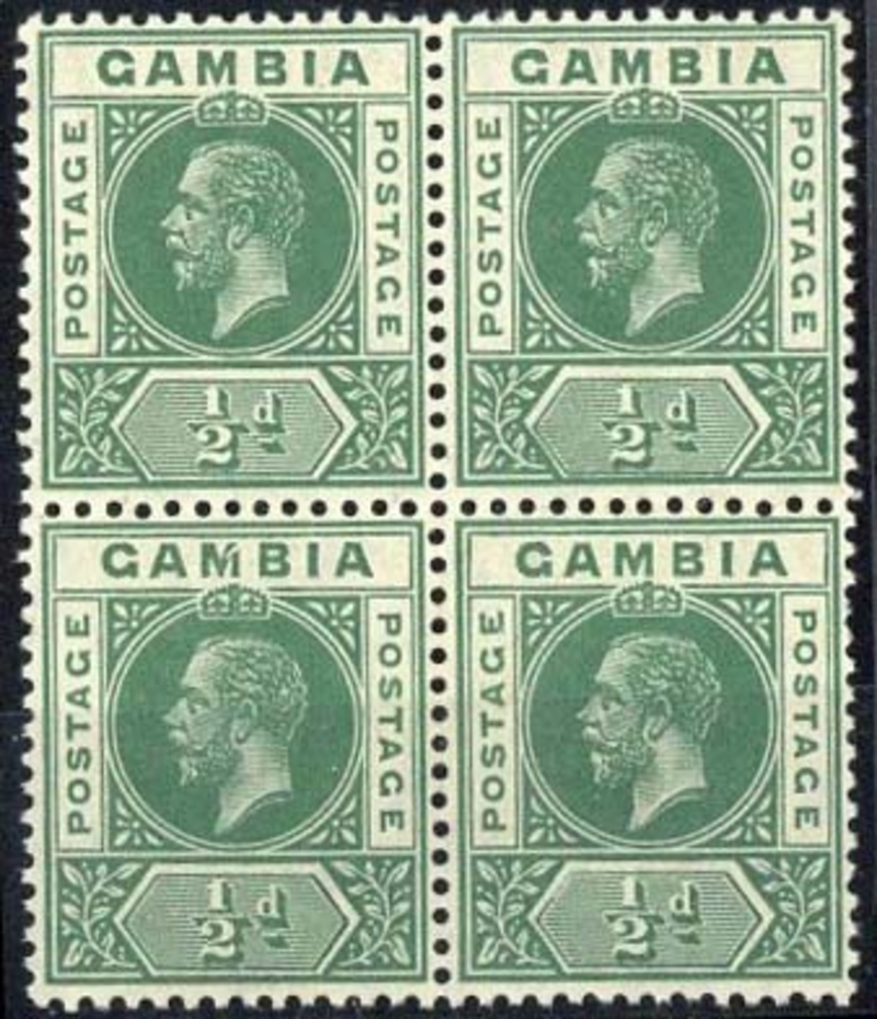 ½d. green block of four, the lower left stamp showing split "m" in "gambia" flaw, fresh lightly mounted mint; most unusual