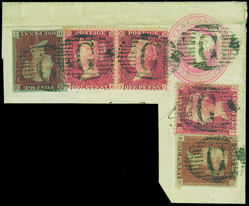 1858 (Oct.) 1d. pink envelope piece additionally bearing imperforate 1d. Plates 12 and 27 and 1d. rose-red LC14 (3), all cancelled "g" and showing characteristic over-inking at the right side, Worthing arrival c.d.s. (8.10) on reverse; crease at top crosses the embossed stamp where folded prior to use. A rare and most unusual usage of imperforate and perforated stamps in Gibraltar and accompanied by notes on plating by Dr. W.R.D. Wiggins. Photo