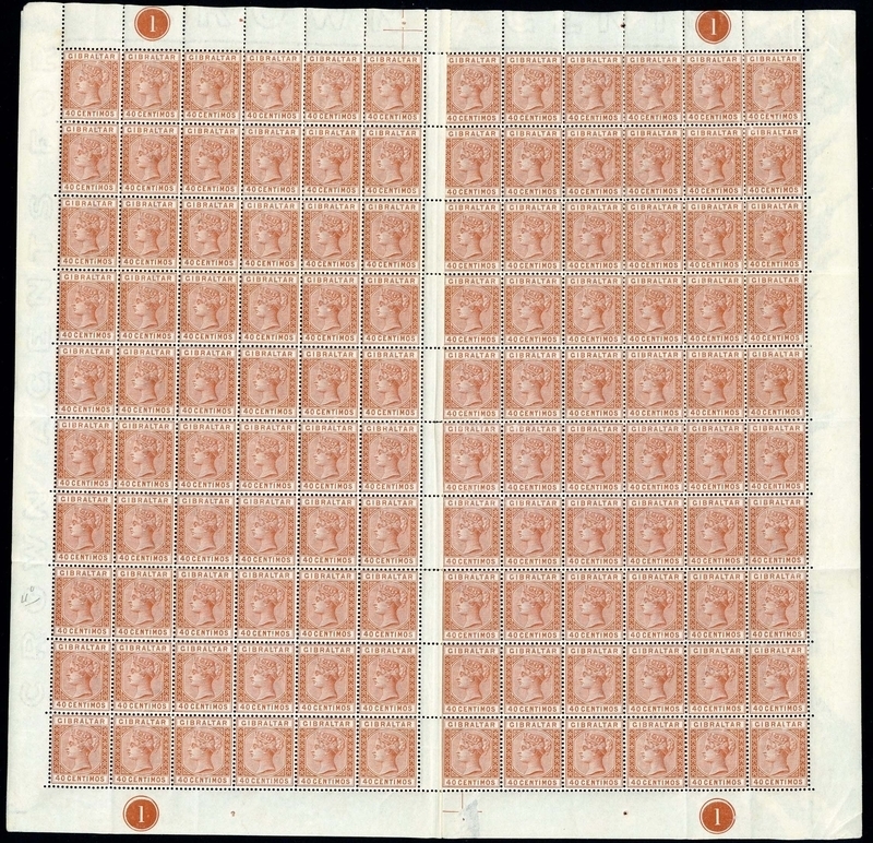 1889-96 40c. orange-brown complete sheet of 120; one column with a vertical bend and some paper adhering in margins and a couple of stamps, otherwise fine with nearly all stamps unmounted mint. S.G. 27, £450+
