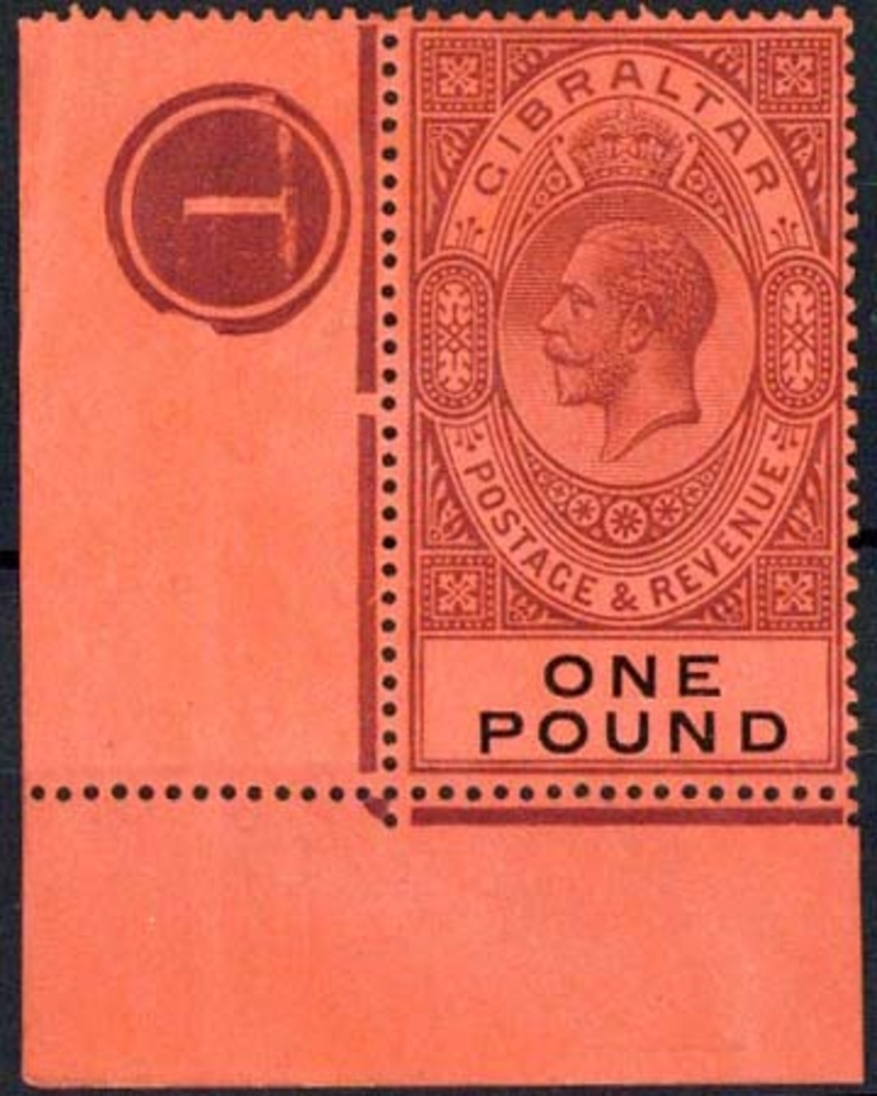 1912-24 £1 dull purple and black on red from the lower left corner of the sheet with plate number, fresh mint; a little creased or wrinkles in the margin, otherwise fine. S.G. 85, £140