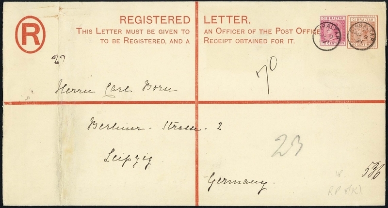 1891 (9 Apr.) 20c. K size registered envelope to Germany, uprated with 10c. and 40c. neatly cancelled by c.d.s., transit datestamps on reverse; vertical crease at left and fractionally truncated at right though in fine condition for an envelope of this size, and scarce with a total of only 3,100 printed