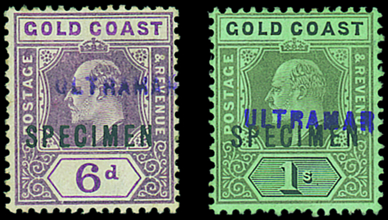 ½d., 1d., 2½d., 6d. and 1/-, each overprinted "specimen" and handstamped "ultramar" by a Receiving Authority, without gum as usual; 2½d. with a vertical crease, otherwise sound. Photo