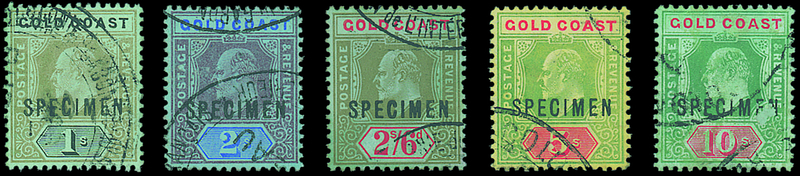 1/-, 2/-, 2/6d., 5/- and prepared for use but not issued 10/-, each overprinted "specimen" and with portions of the Gabon Direction De L'Interieur or Secretariat General Receiving Authority handstamps, without gum as usual; some colour loss and 10/- with surface abrasions though a rare group. Photo