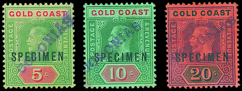 ½d. to 20s. less 1d., all overprinted "specimen" and further handstamped "colonias" diagonally in violet by a Receiving Authority, without gum as usual; a few with colour loss in places though a rare set. Photo