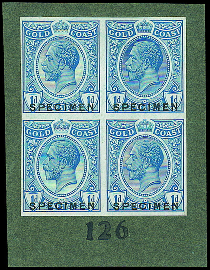1922 (c.) printer's sample 1d. blue imperforate block of four on glazed paper, each overprinted "specimen" (DS1) and affixed to piece cut from printer's sample book numbered "126"; fine and rare. Photo