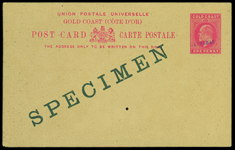 1903 1d. carmine card, overprinted "specimen" and handstamped "ultramar" by a Receiving Authority; small hole at centre, otherwise sound. Rare. Photo