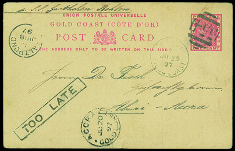 1897 1d. card (central crease) to Aburi, Accra with "554" barred oval cancellation, framed "too late" and c.d.s. of Saltpond (18.6). Rare. Photo
