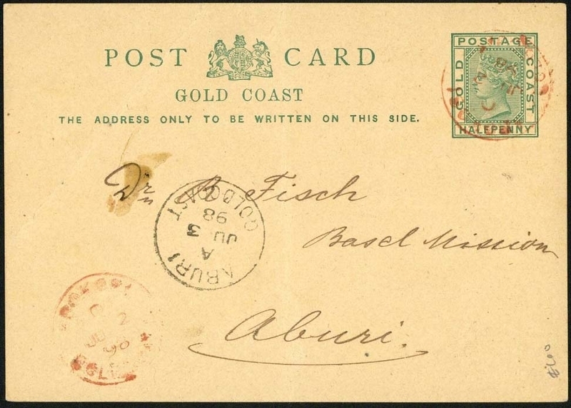 1898 (2 June) ½d. card from Abokobi to Aburi cancelled in red, arrival c.d.s.(3.6) on face, fine