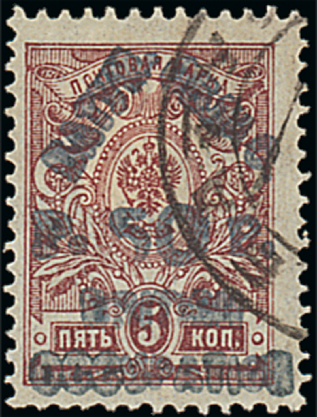 50r. on 5k. brown-lilac, fine used; also two unused examples with forged surcharges, one showing raised "5". B.P.A. Certificate (1992). S.G. 26, £500. Photo