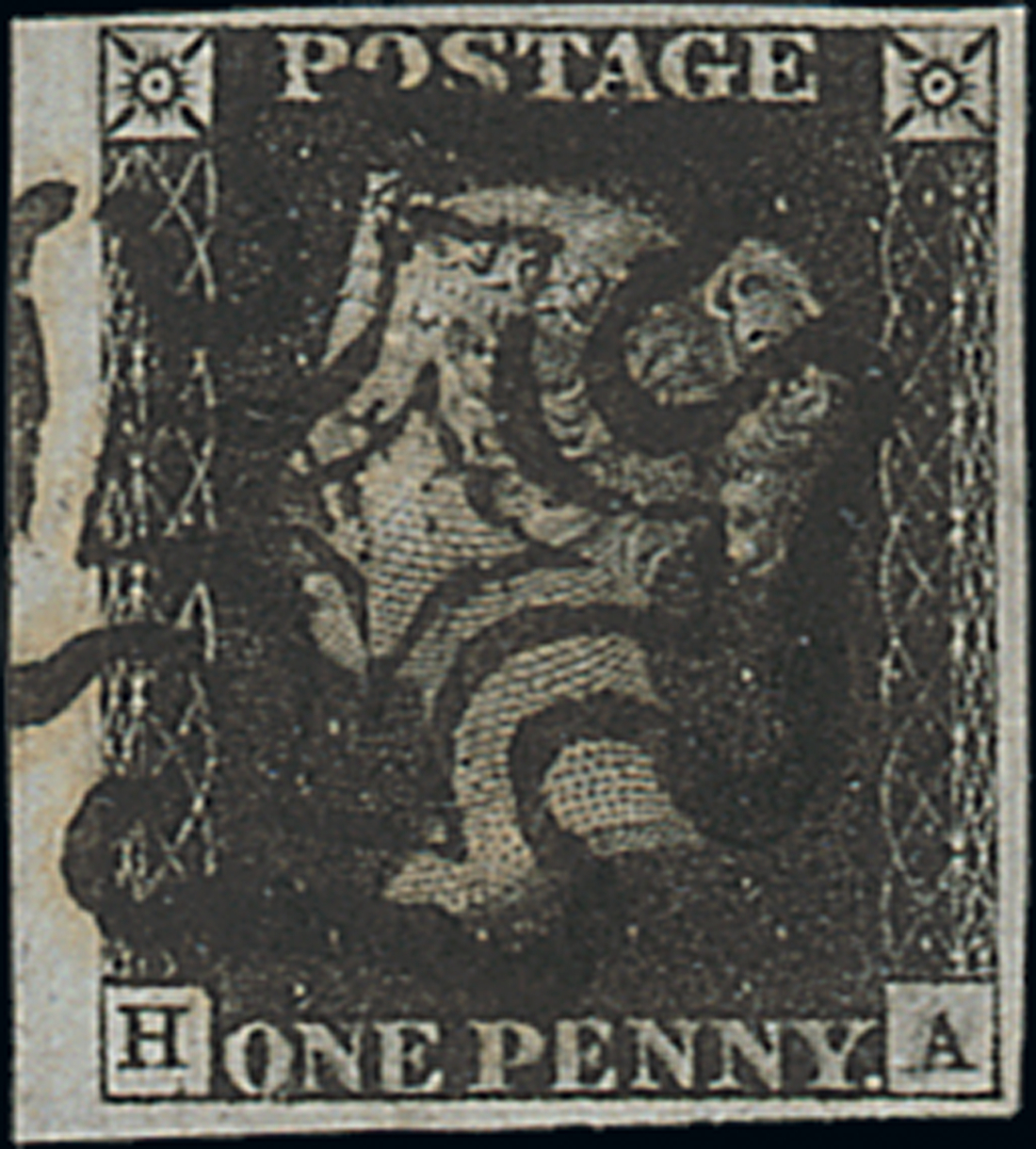 HA, double letter A, practically complete black Maltese Cross cancellation, very large margins all round and with part of sheet margin at left; very fine and most attractive. R.P.S. Certificate (2004). Photo