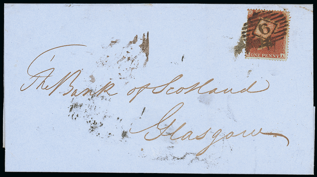 KA, tied by London Inland "9" barred oval cancellation on 1854 (17 May) entire to Glasgow; seal removed from reverse, centred to left, fine. S.G. CE2, £2,100. Photo