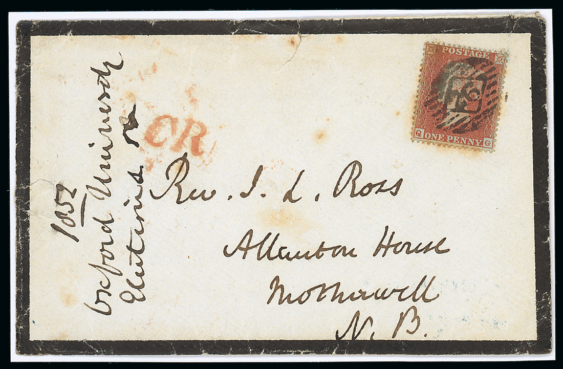 QG, traces of staining around the perfs., tied by London Inland "26" in barred oval cancellation to mourning envelope dated 9 April 1852 addressed to Motherwell, red "cr" (Caledonian Railway) handstamp on front, short filing note and some small faults but otherwise fine and most attractive and a scarce early date. S.G. CE2, £2,600. Photo