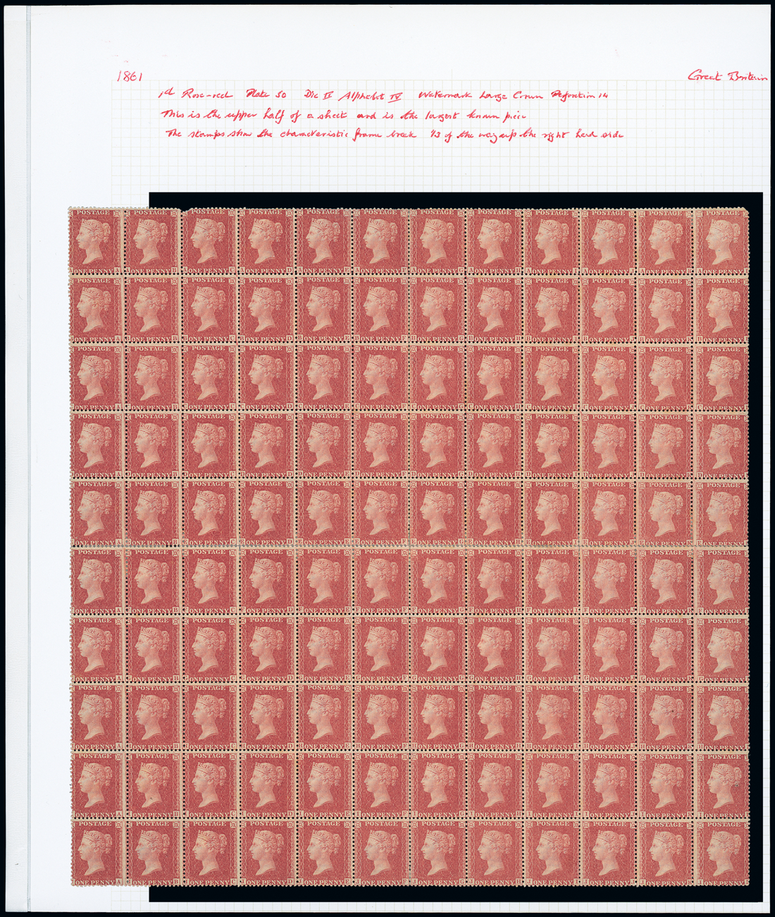1d. rose-red, Plate 50, AA-JL, block of 120 being the top half of the sheet, without margins, original gum; AC with defect at top, a few other defects and split and rejoined between the "E" and "F" rows, brilliant colour and extremely fine for a multiple of this size. A unique and famous block. S.G. 42, £30,000+. Photo