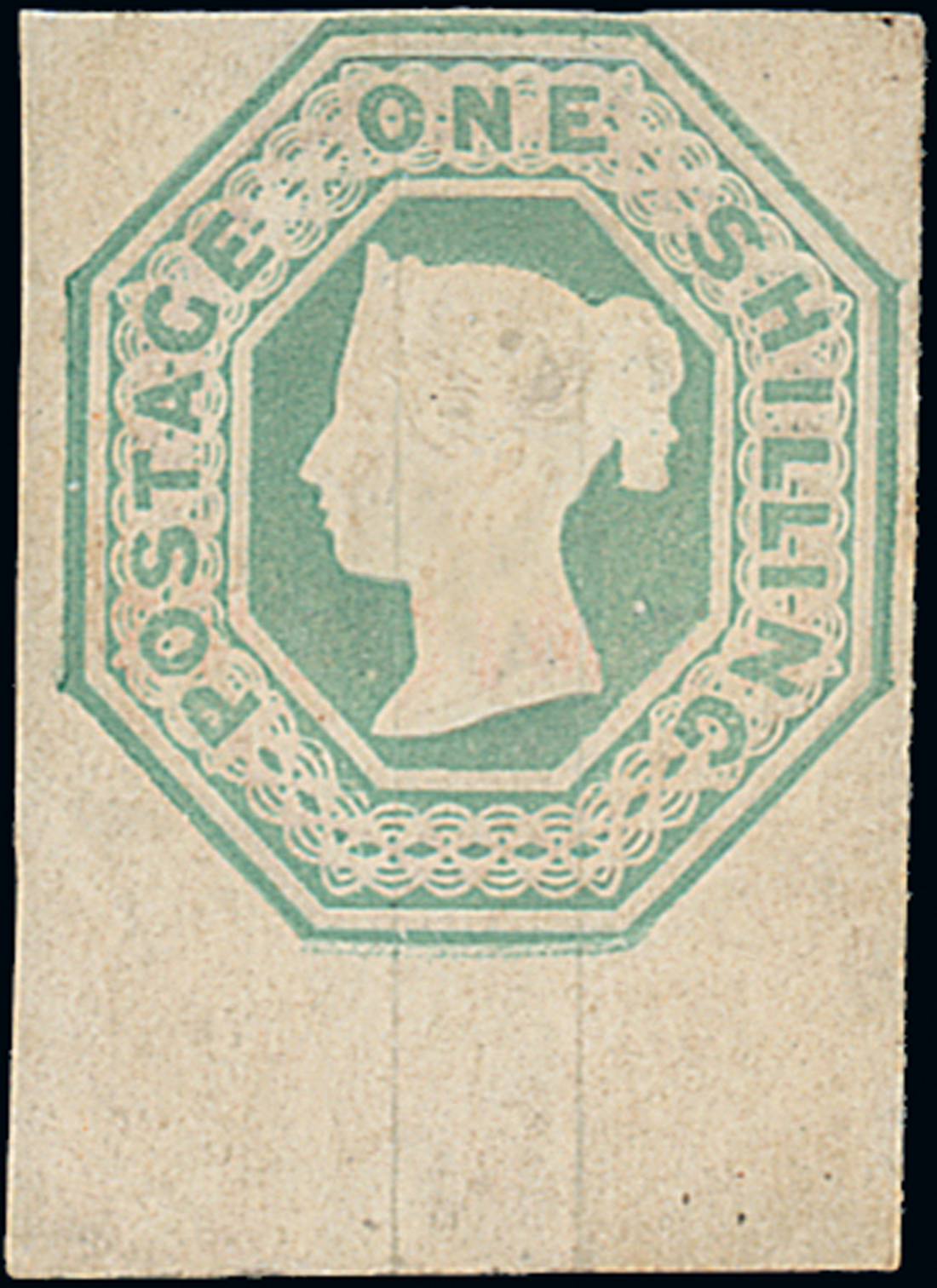 1/- pale green, unused from the foot of the sheet with 10mm. margin and close to large margins other sides, unused without gum, a trifle soiled, small embossing split at top. Scarce. S.G. 54, £17,500. Photo