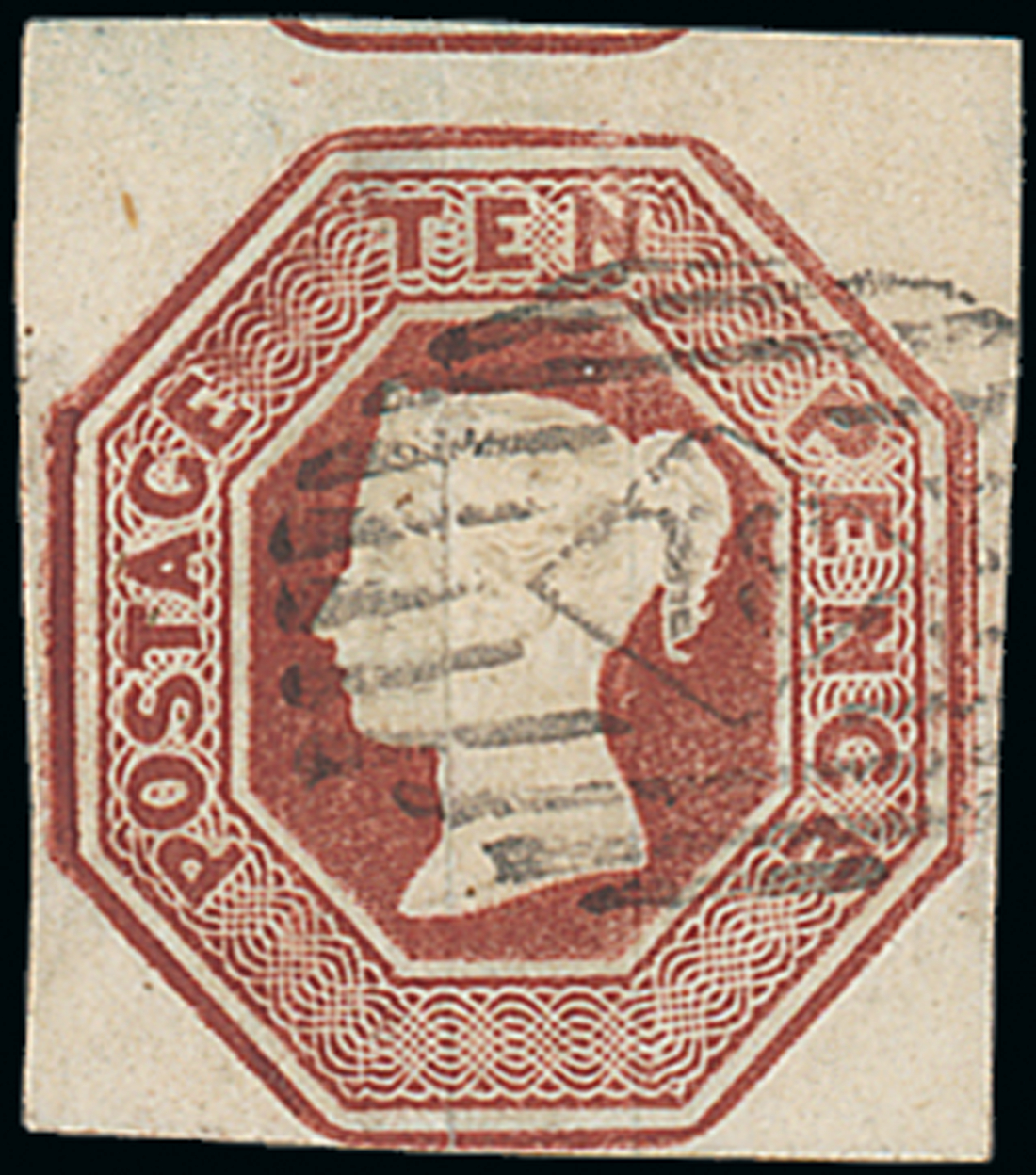 10d. brown, London Inland section cancellation, just touched at foot, good to large margins other sides and showing a portion of the adjoining stamp at top, a couple of tiny thins, otherwise fine. S.G. 57, £1,200. Photo