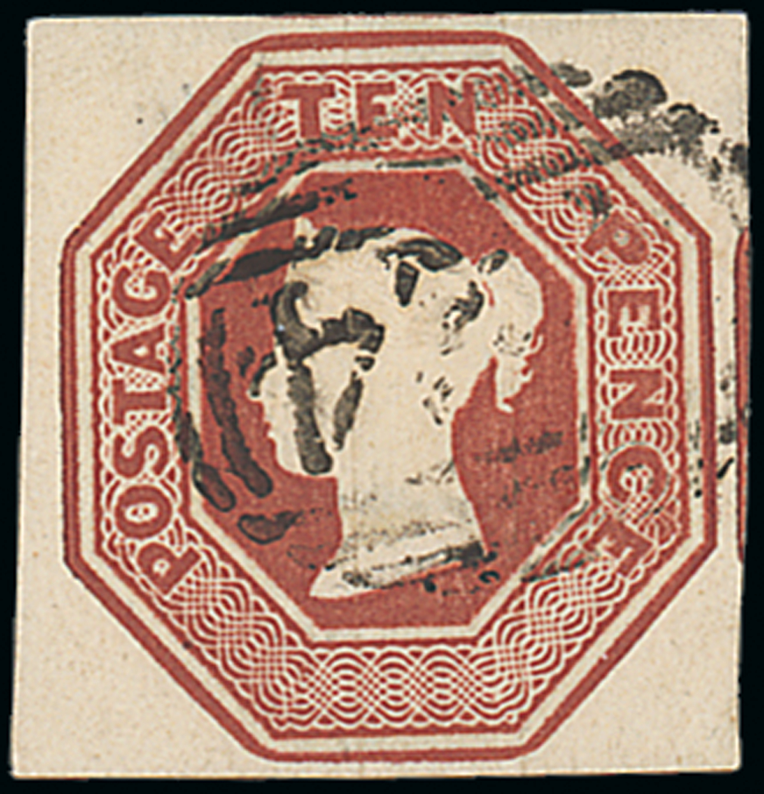10d. brown, good to large margins all round and showing a portion of the adjoining stamp at right, numeral cancellation, sharp embossing, a little thinned. S.G. 57, £1,200. Photo
