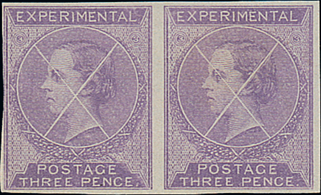 1861 De la Rue 3d. Essay in violet depicting the head King Pedro V of Portugal, imperforate horizontal pair from a defaced die, ungummed, close to good margins, fine. Photo