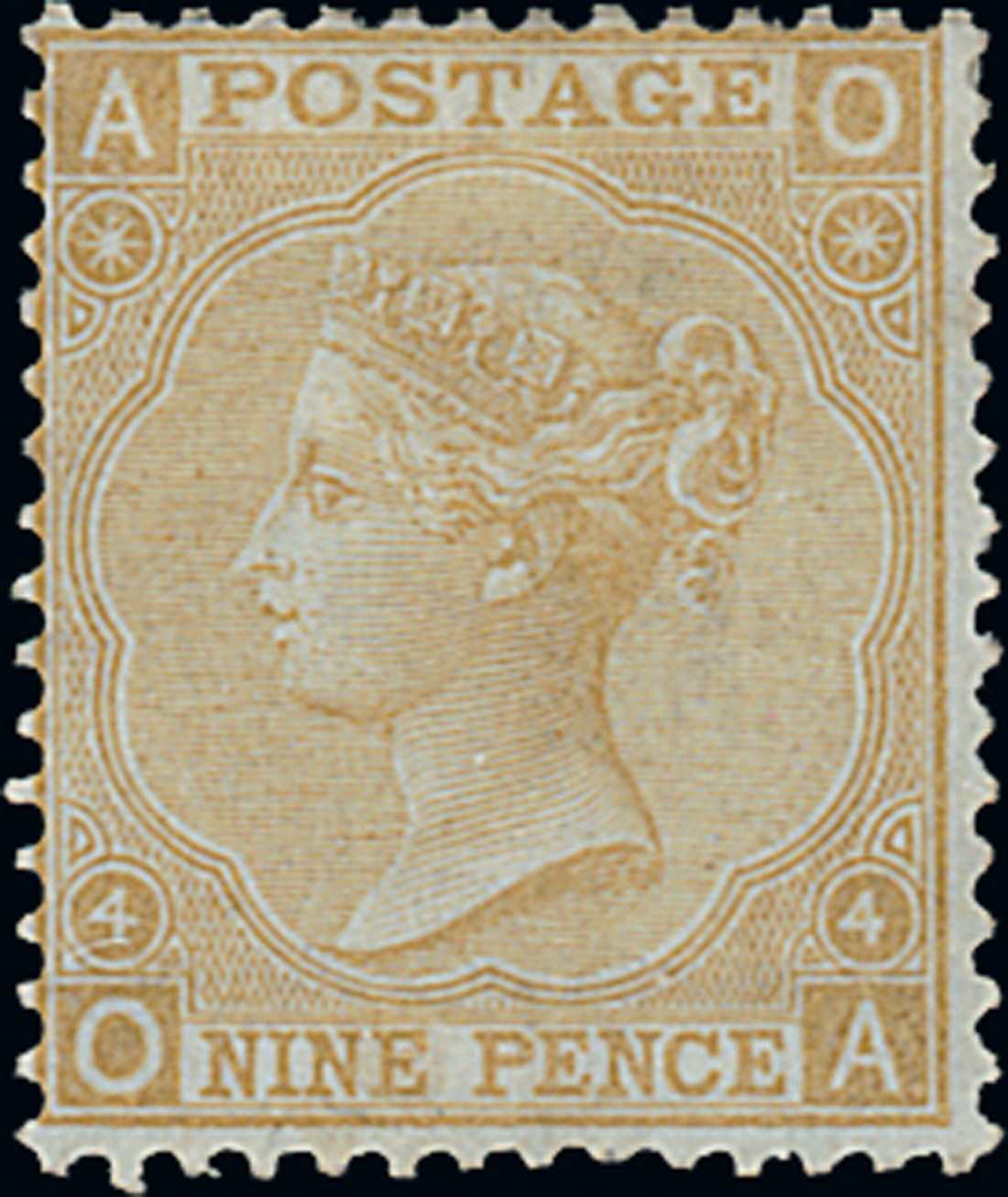 9d. straw, Plate 4, OA, large part original gum, good colour and perfs., fine. S.G. 111, £1,900. Photo