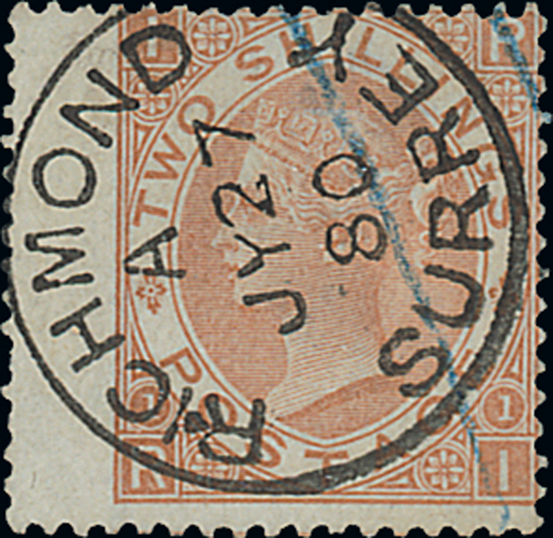 2/- brown, Plate 1: PI, wing margin example with superb Richmond Surrey c.d.s. of 27 July 1880, two blue crayon lines, two short perfs. and tiny corner crease in the wing margin at right. Rare. S.G. 121, £3,500. Photo