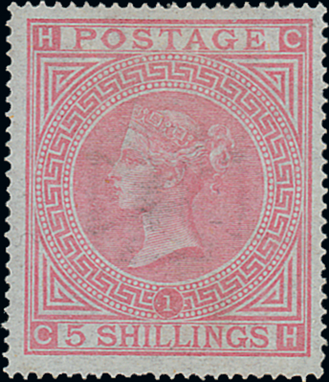 5/- pale rose Plate 1, CH, large part original gum, short perf. at foot, good colour and well centred, fresh and fine. Rare. S.G. 127, £8,250. Photo