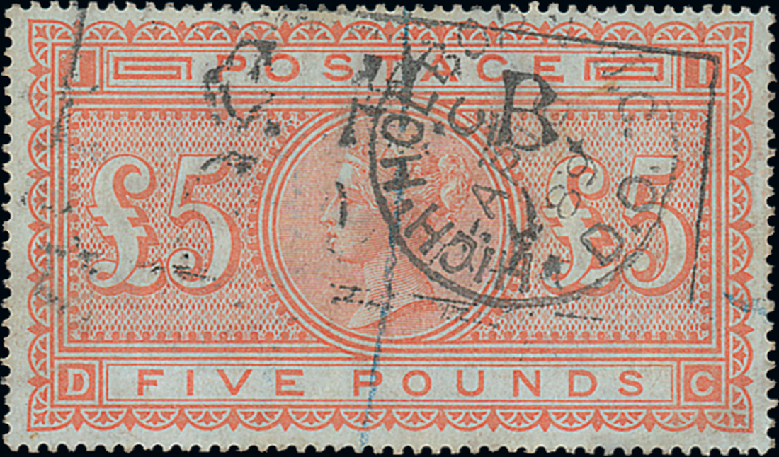 — £5 orange, DC, High Holborn c.d.s and boxed C.H.B. cancellations, creased at right and small blue crayon mark but still an attractive example of this scarce stamp. S.G. 133, £13,000. Photo