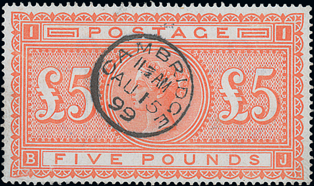 — £5 orange, BJ, Cambridge c.d.s. of 15 Aug. 1899, bright colour, good perfs.; very fine. S.G. 137, £4,750. Photo