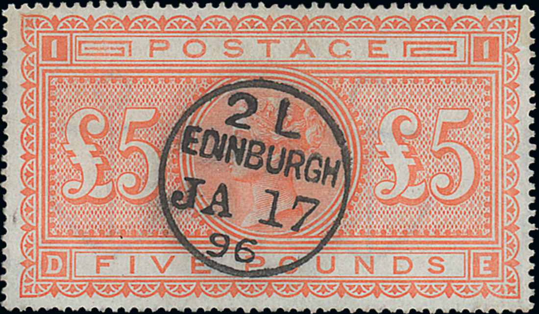 — £5 orange, DE, Edinburgh c.d.s. of 17 Jan. 1896, good colour, some slightly short perfs., fine. S.G. 137, £4,750. Photo