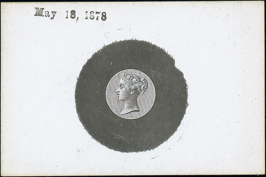 1878 die proof of the Queen´s head with uncleared surround, in black on glazed card (92x60mm.), dated May 18, 1878; fine. Photo