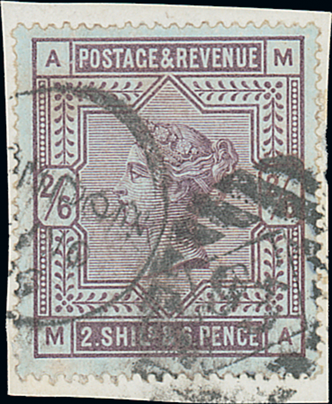 2/6d. deep lilac on blued paper from the white paper period, MA, tied to small piece by London duplex cancellation, fine and rare. R.P.S. Certificate (1984). S.G. 179a, £3,500. Photo