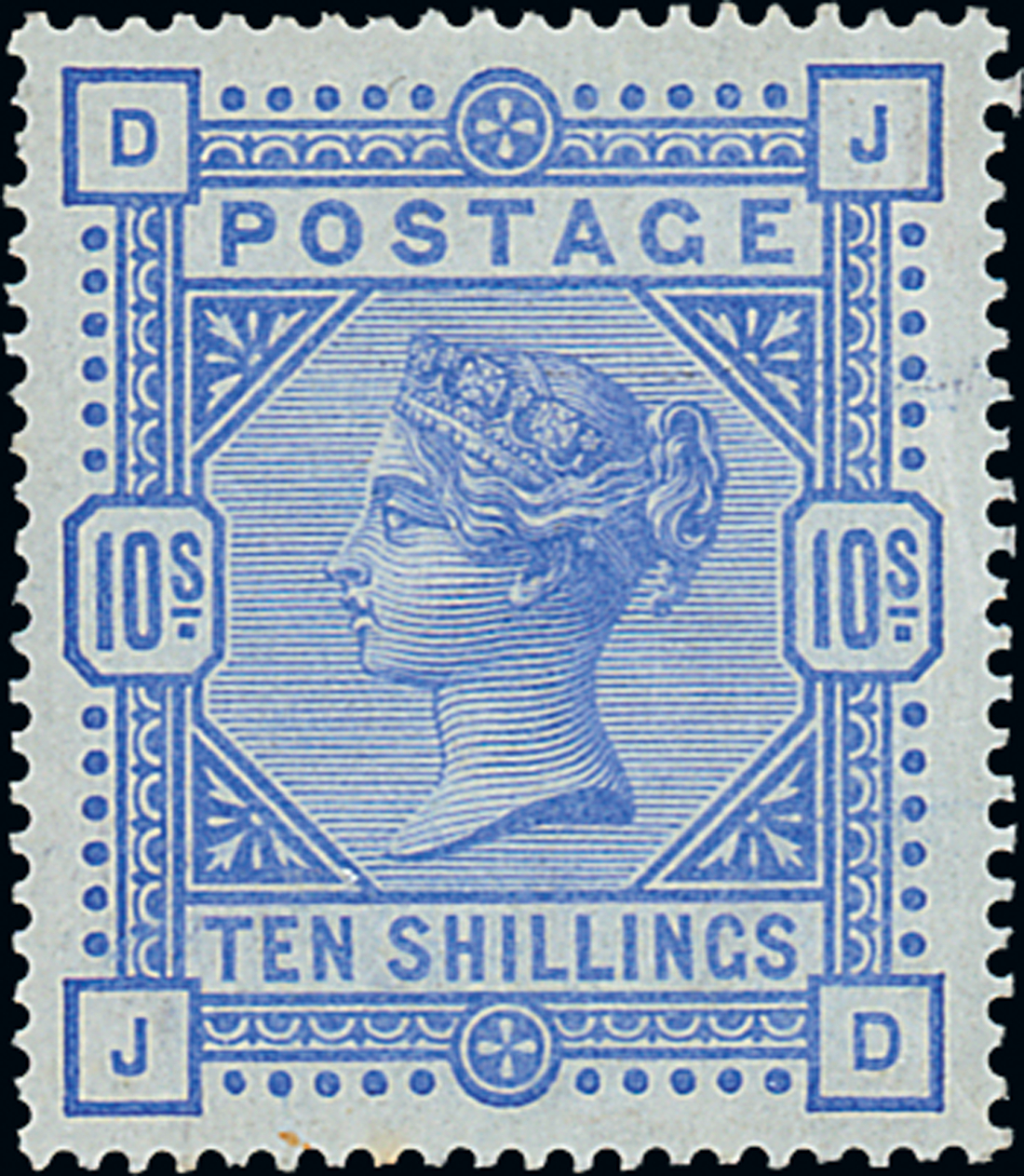 10/- ultramarine, JD, large part original gum, good colour and perfs., two light diagonal creases at upper right, a few coloured marks on reverse and slightly stained perf. at foot. S.G. 183, £2,000. Photo