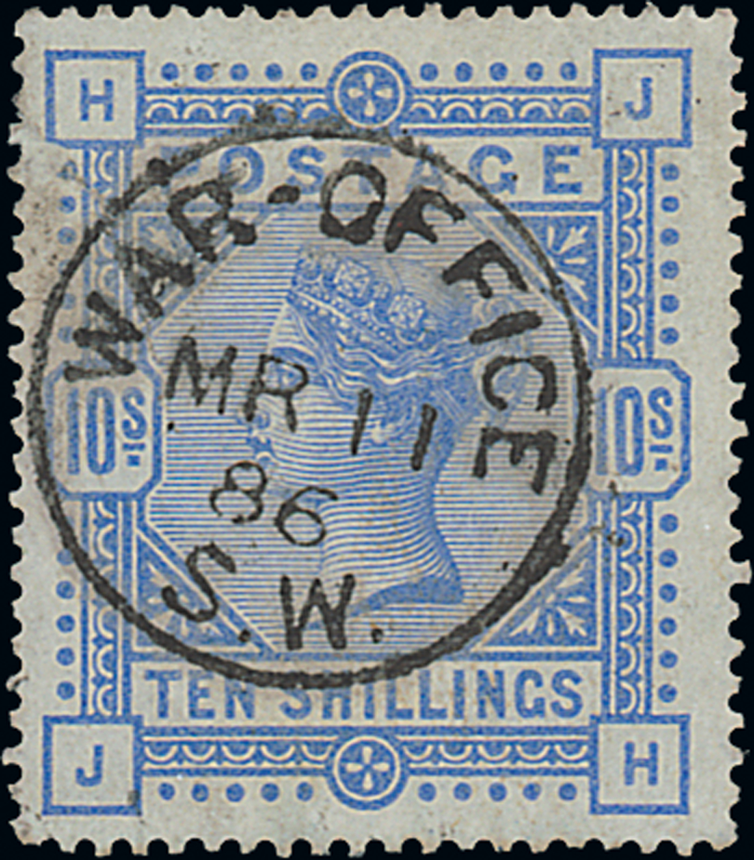 10/- pale ultramarine, JH, central "war office/s.w." cancellation of 11 March 1886, repaired at left but a very rare cancellation. S.G. 183a. Photo