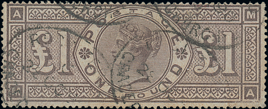 £1 brown-lilac, MA, oval Gracechurch St. cancellations, small rub at lower right, fair colour, scarce. S.G. 185, £2,750. Photo