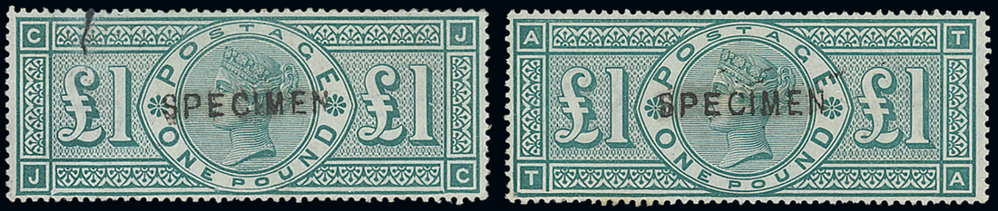 JC and TA, the two broken frame varieties, each overprinted "specimen" type 11, part original gum, the first with ink mark on the face at upper-left, fine and a rare pair. Photo