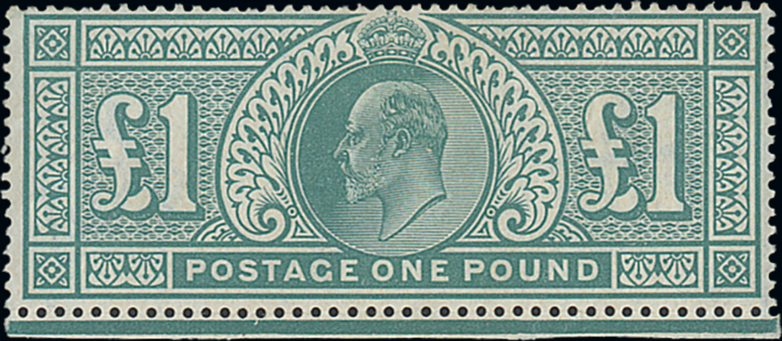 £1 dull blue-green, large part original gum and with part of sheet margin at foot, light gum creases and a few short perfs. at top, fine. S.G. 266, £2,000. Photo
