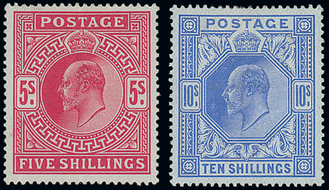 5/- bright carmine and 10/- blue, part original gum, 10/- with short perf. at top, otherwise fine. S.G. 318-319, £1,400. Photo