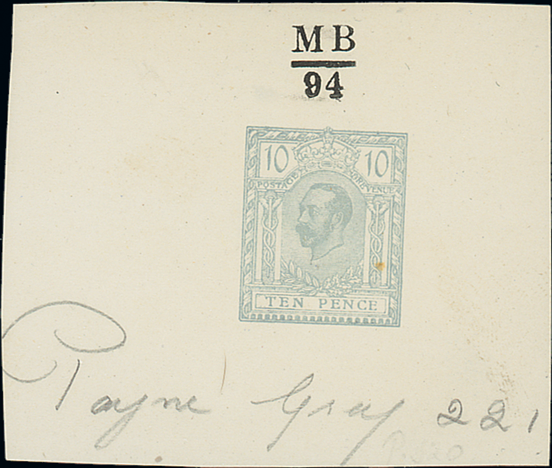 — 10d. grey, on white wove paper (60x52 mm) with handstruck "MB/94" in black above the design and pencil manuscript "Payne Grey 221.." below; fine, fresh and very attractive. Rare. Photo