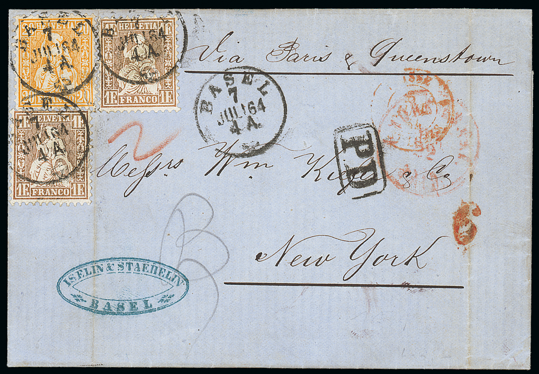 1864 (7 July) entire letter to New York, via Paris and Queenstown, franked 1862-64 20c. orange-yellow, 1f. bronze-gold (2) with Basel cancellations, the 20c. with small corner crease and the 1f. a trifle oxidised, fine and a scarce franking. Zumstein Certificate (1999). Photo