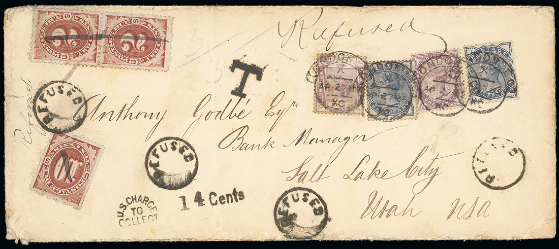 1885 (27 April) long envelope to Utah franked Great Britain 1881 1d., 1883 or 1884 ½d. (2) and 2d. with London hooded cancellations, New York arrival (9.5) on reverse, "u.s. charge/to/collect" and "14 Cents", U.S. 1879 Postage Due 2c. (vertical pair) and 10c. pencancelled, manuscript and "refused" handstamps, some minor peripheral faults but scarce. Photo