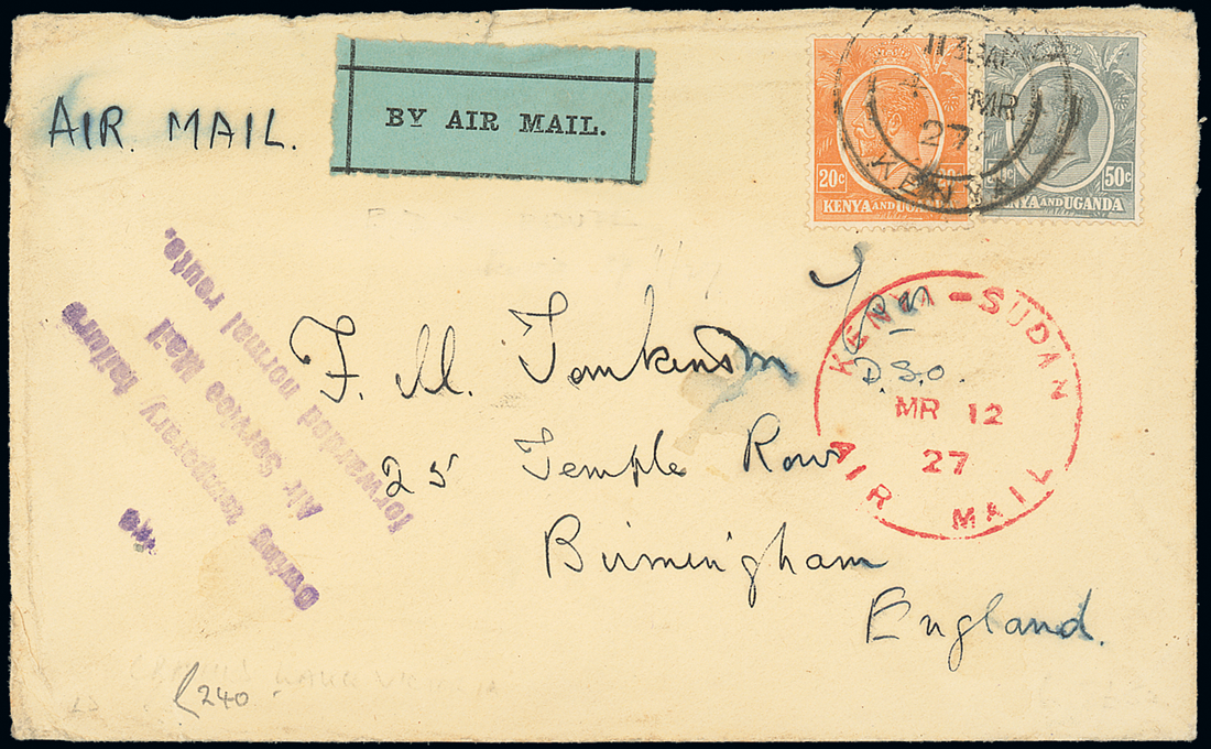 1927 (12 March) Kisumu to Khartoum flight, crashed on take off from Lake Victoria, envelope franked Kenya 20c. and 50c., violet "Owing temporary failure/Air Service Mail/forwarded by normal route" cachet, red "kenya-sudan" datestamp; fine. Nierinck 270312. Photo
