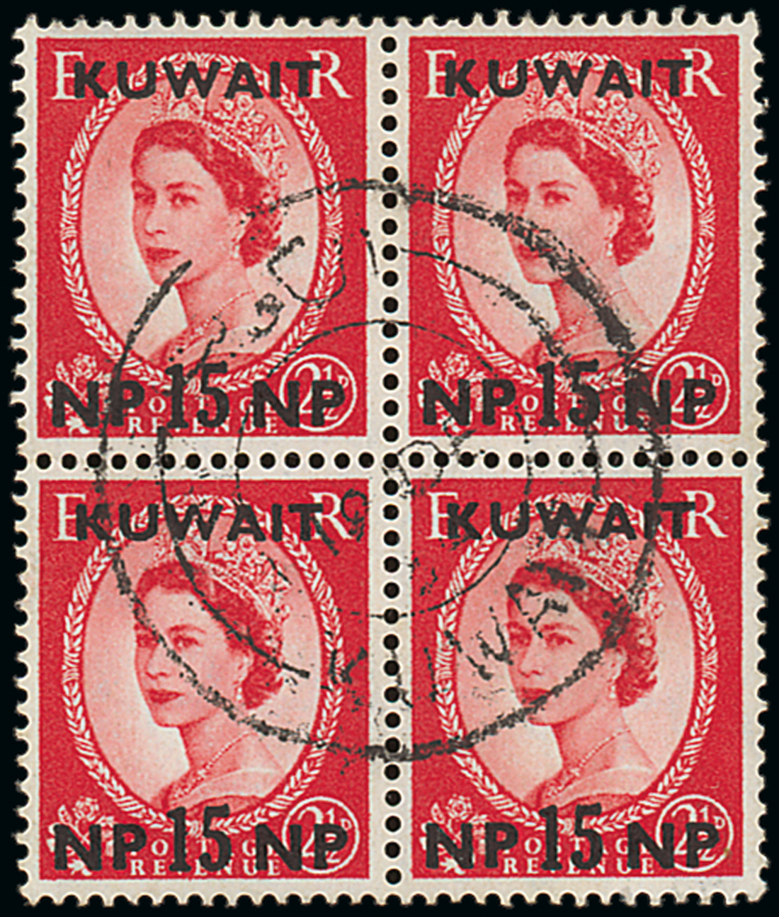 1958 15n.p. on 2½d. carmine-red Type II, a block of four with central bi-lingual c.d.s.; fine. S.G. 125a, £400. Photo