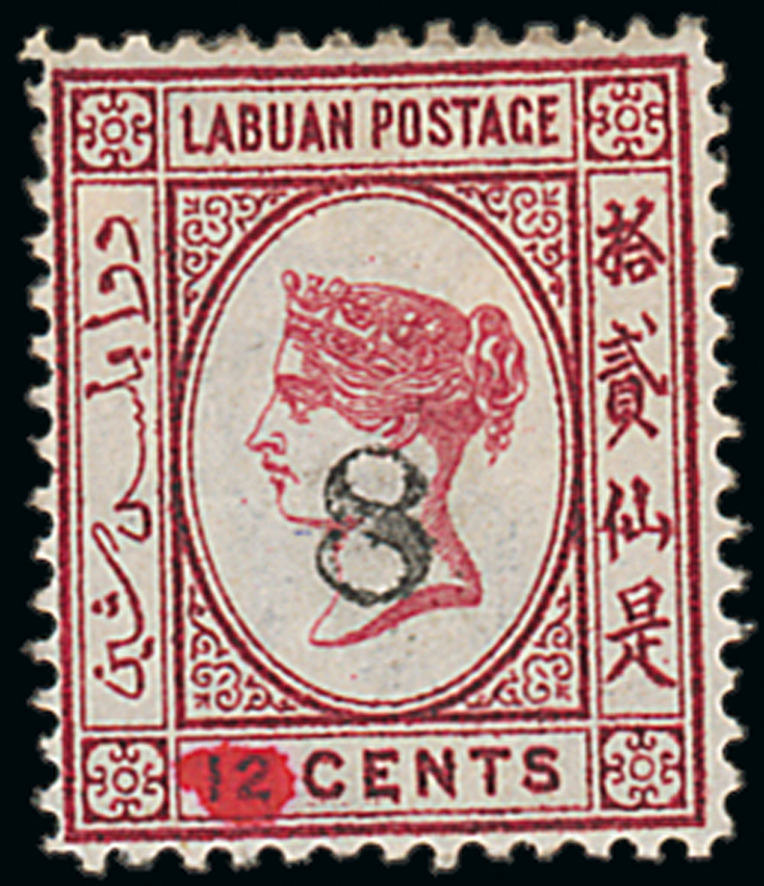 1880 (Aug.) original value obliterated by manuscript bar in red, 8c. on 12c. carmine with watermark reversed, unused with small part original gum; scarce. B.P.A. Certificate (1981). S.G. 11x, £1,800. Photo